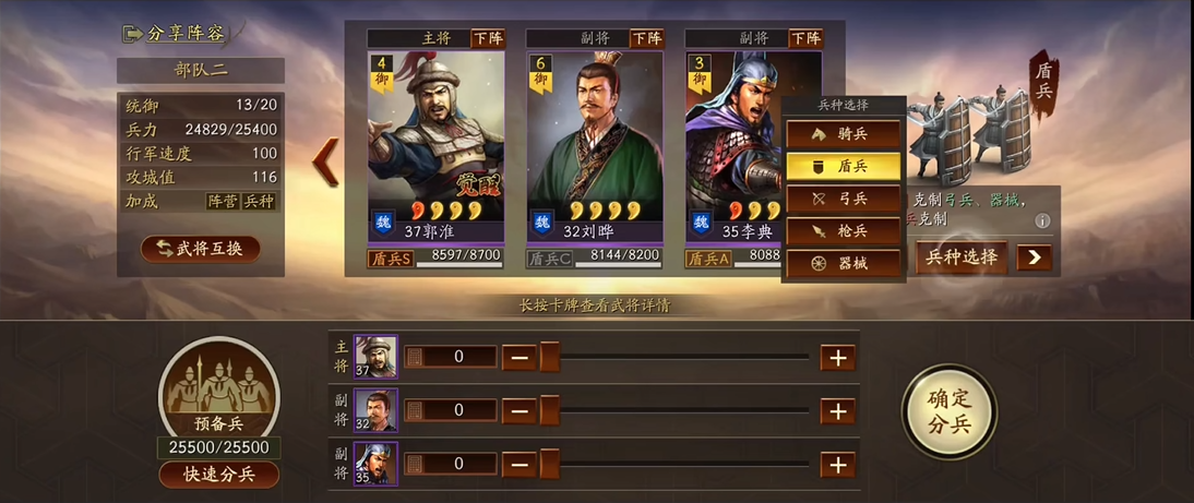 阵法在实战中的运用与选择,离不开对高顺自身定位的清晰认识。他的兵种适性仅盾兵为S级,这自然限定了其阵法发挥的舞台主要在盾兵体系内。在阵法布置上,他通常不作为主将,而是处于辅助或副将位置,专注于通过陷阵营提供属性光环和急救效果。需要搭配如御敌屏障、暂避其锋等其他减伤或防御类阵法或战法,与陷阵营的急救机制形成互补,从而构建出一个能抗能恢复的综合性盾阵,有效应对不同对手的进攻节奏,实现降低战损的战略目的。