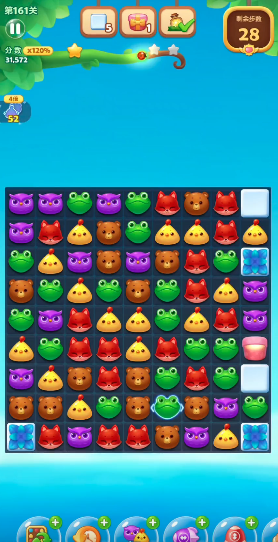在游戏的中段推进时,需要集中火力处理底部区域的冰块,这是阻碍动物下落的关键障碍,若底部暂时无法形成消除机会,可转而激活魔法石触发连锁反应,同时利用鸡窝爆发产生的小黄鸡填补空缺,当独眼仔出现时,应保留其释放的全屏特效用于后期清理死角。