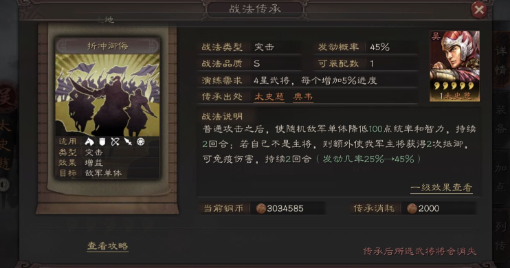 战法的演练和学习过程也进一步固化了其不可取消的特性。一个新获得的战法(无论是传承战法还是事件战法)并非立即可用,需要消耗战法点或武将卡进行演练,将熟练度提升至100%后才能装备给武将使用。这意味着,投入战法点的过程本身也是一种资源投放,一旦完成,战法便与玩家的战法库绑定。游戏内不存在一个功能可以让玩家将已学会的战法作废并返还相应的武将或战法点,战法的调整通常只能通过为武将重新学习另一个战法来覆盖实现。